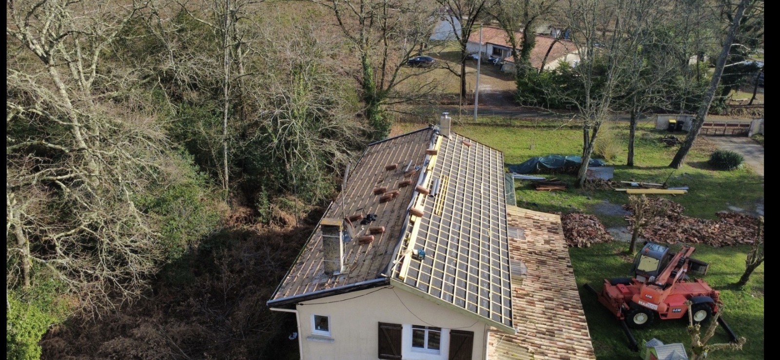 Découverture d’une toiture en tuiles canal sur la commune d Origne en Gironde et aux portes des Landes mis en place d’un film sous toiture de contre lattages et de liteaux traçage de chaque rend de tuiles galleane 12 sylvacane mis en place des tas de tuiles et couverture de la toiture pose de bandeaux bois classe 4 et dé closoir alu plomb pour le faîtage chantier terminé client heureux que de mieux la satisfaction client est l’une de nos priorités